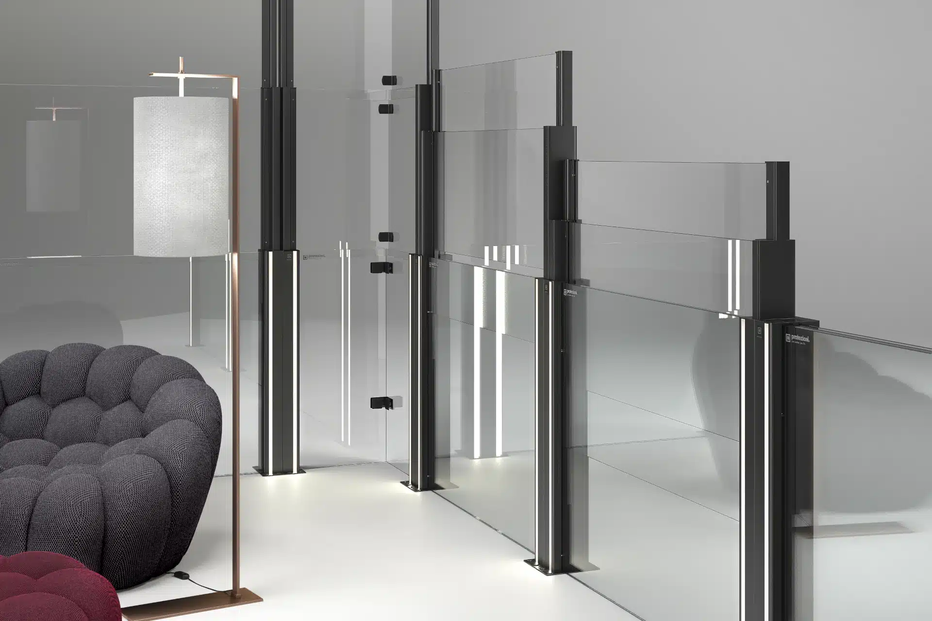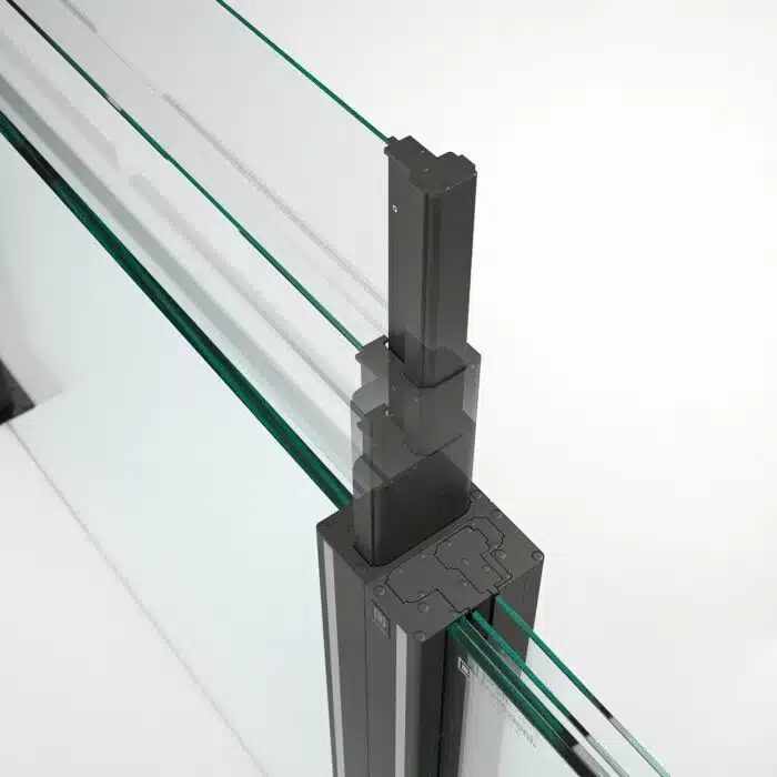 La partie basse est entièrement personnalisable, avec le choix entre verre, aluminium plein ou lames décoratives, afin de répondre aux exigences esthétiques et fonctionnelles de chaque environnement. Les vitrages peuvent être droits ou courbes, offrant une grande liberté de design et une adaptation optimale à l’architecture existante.